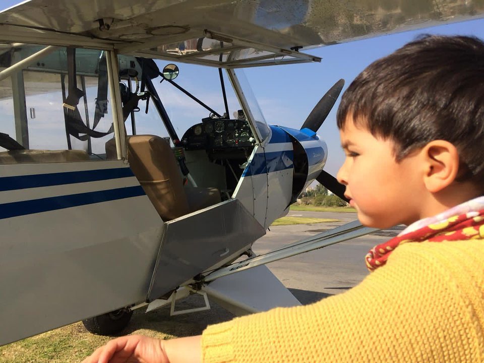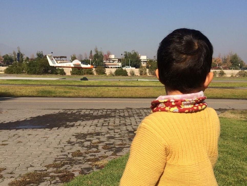 Der kleine 4-jähriger Fan von Flugzeugen, der zum Stadtflugplatz von Vitacura kam, um die Flugzeuge, Hangare, Segelflugzeuge kennenzulernen und Starts und Landungen genau zu beobachten -