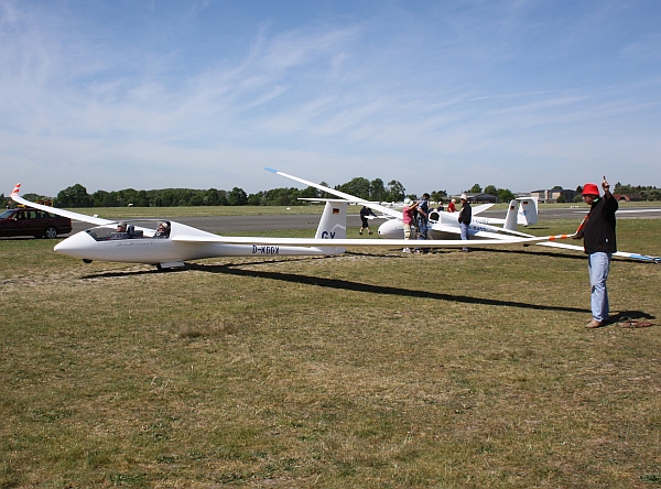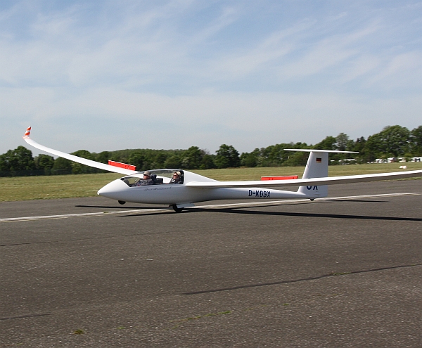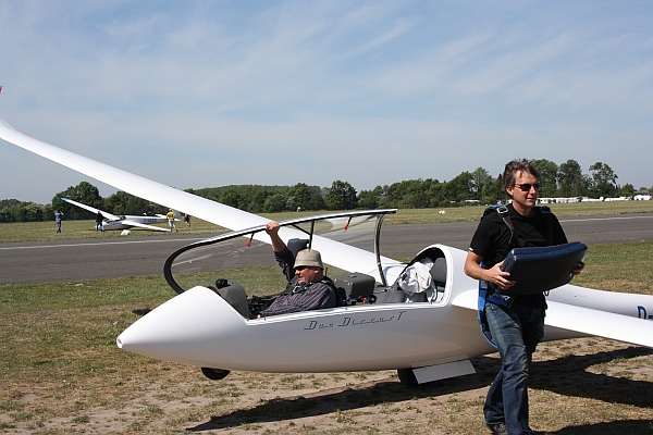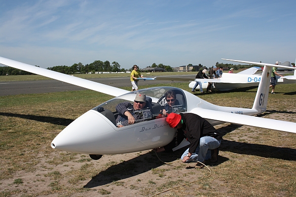 das muss ich euch erzählen..... Ich bin mit meiner Segelflugausbildung recht weit fortgeschritten und nun stehen nach und nach Umschulungen auf leistungsfähigere Flugzeuge an. Ich hab wegen meiner Vorliebe für polnische Segelflugzeuge eh schon immer innere Konflikte gehabt, dass mir die Flugzeuge aus dem Hause Schleicher, die zweifelsohne tolle Flugzeuge bauen, immer mehr ans Herz wachsen und dann krieg ich die Möglichkeit, einen Hochleistungsflieger von Schempp Hirth zu bewegen... Nun hat es sich heute zugetragen, dass alle Schulflugzeuge für eine große Gruppe von Segelfluginteressenten besetzt waren und da fragte mich mein Fluglehrer, ob ich nicht unseren Duo Discus T fliegen wolle? Das Flugzeug ist bei uns sowas ähnliches wie eine heilige Kuh, die normalerweise nicht für Flugschüler in der Ausbildung genutzt wird, aber da ich eh bald mehr Kunststoff fliegen werde, hielt man es für eine gute Idee:-) Ob ich will???? Na klar will ich!!! Naja, ihr habt von mir dieses Jahr ja schon mehrmals gelesen, dass ich gut im Kreis grinsen kann, was ich heute mal wieder eindrucksvoll bewiesen habe. Also Manual geschnappt, wild drin rumgeblättert, Einweisung am Boden und dann ging es schon los.