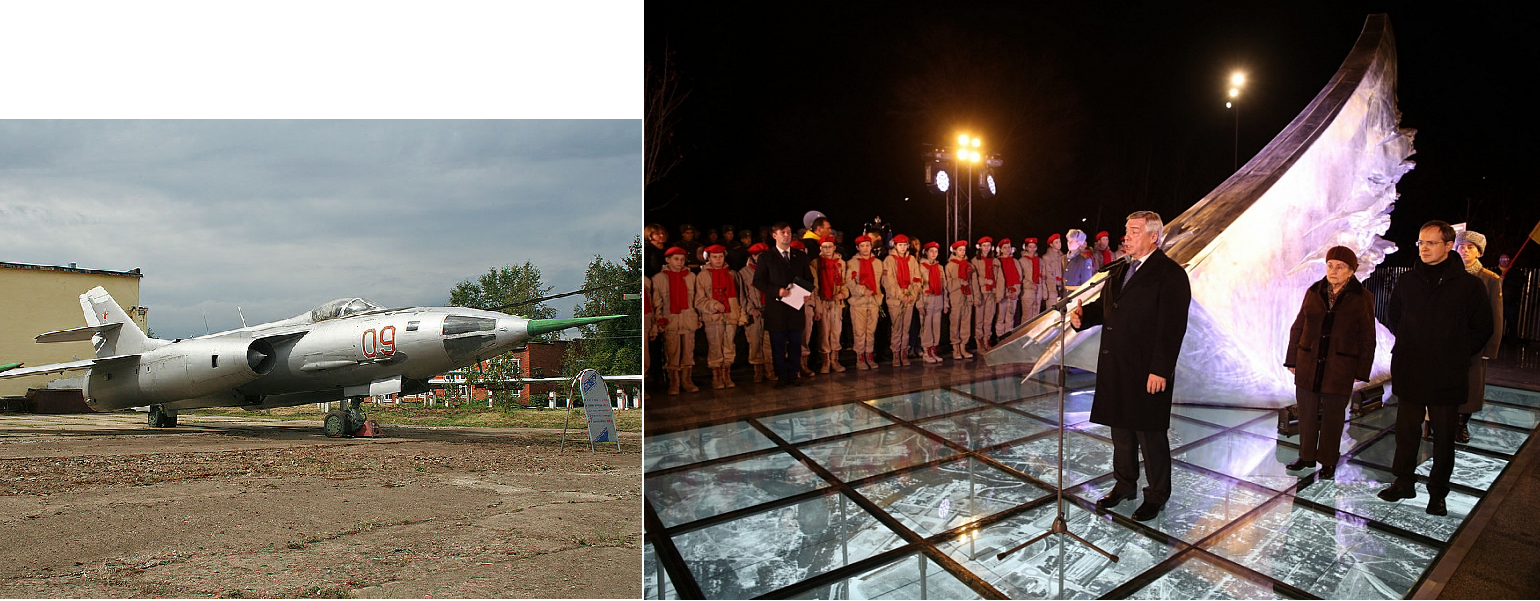 An der Hauptfassade des Denkmals befindet sich ein Jak-28P-Jäger, der die Flugbahn entlang der Oberfläche des "Kiels" passiert hat und heruntergefallen ist. Anhand der architektonischen Komposition kann der Betrachter erkennen, dass die Piloten die Flugbahn des Absturzes des Flugzeugs von der Stadt weg verändert haben.