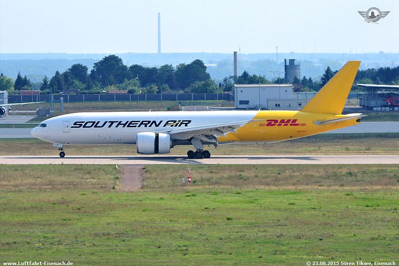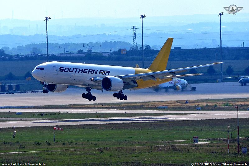 Schon im Zwielicht der untergehenden sonne schwebt Southern Air mit ihrer Boeing 777-200D N714SA ein.