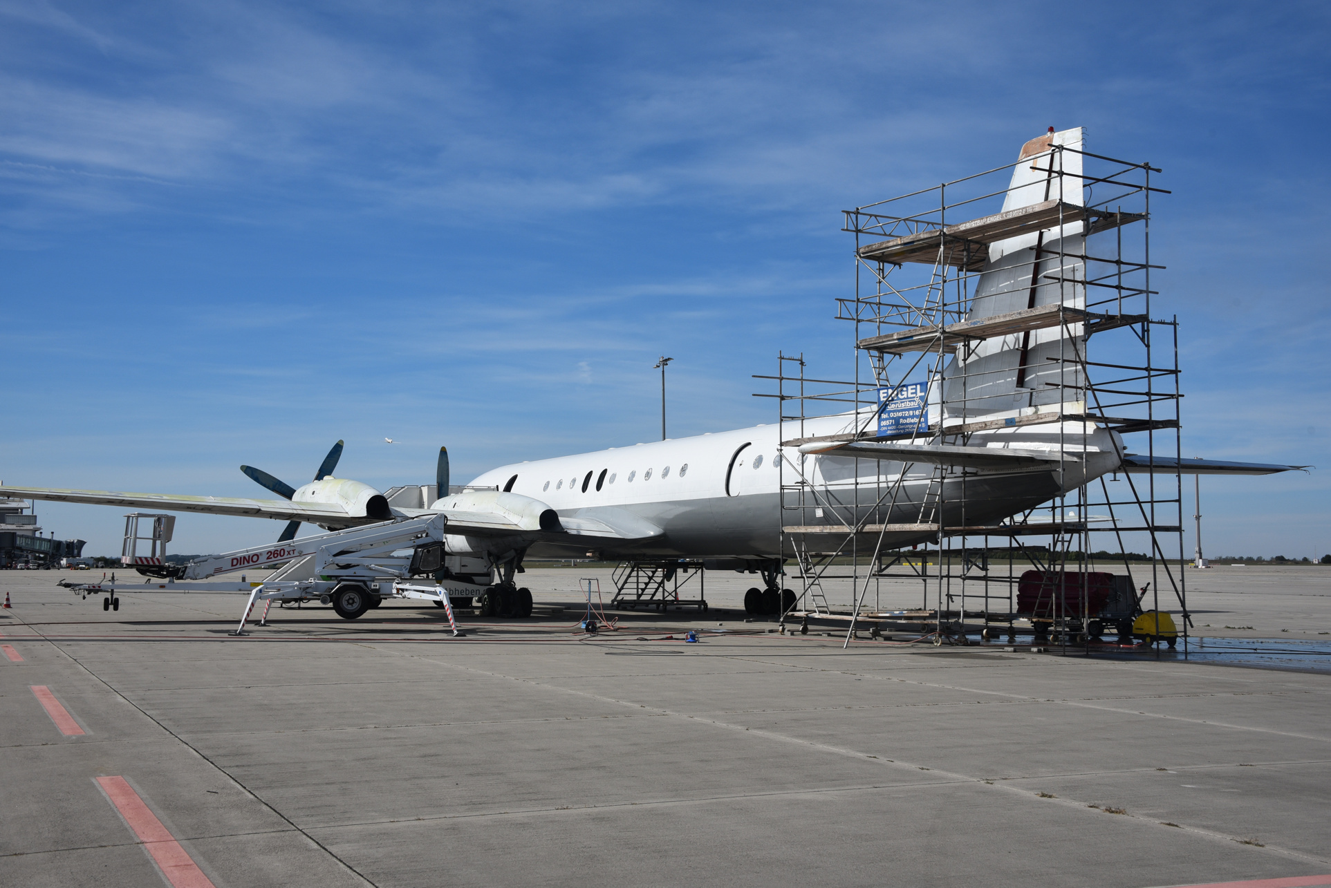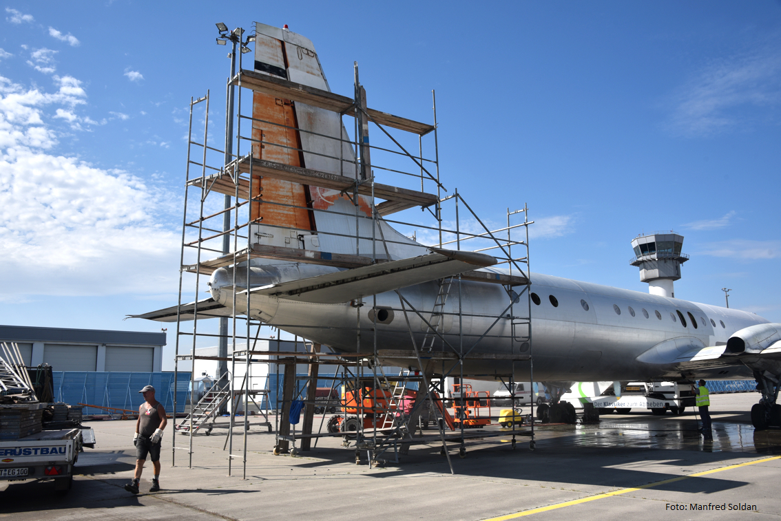 Manfred schreibt: Nach Schwierigkeiten mit der Hebebühne mussten wir wieder den Gerüstbauer in Anspruch nehmen. Das Seitenleitwerk ist doch etwas hoch