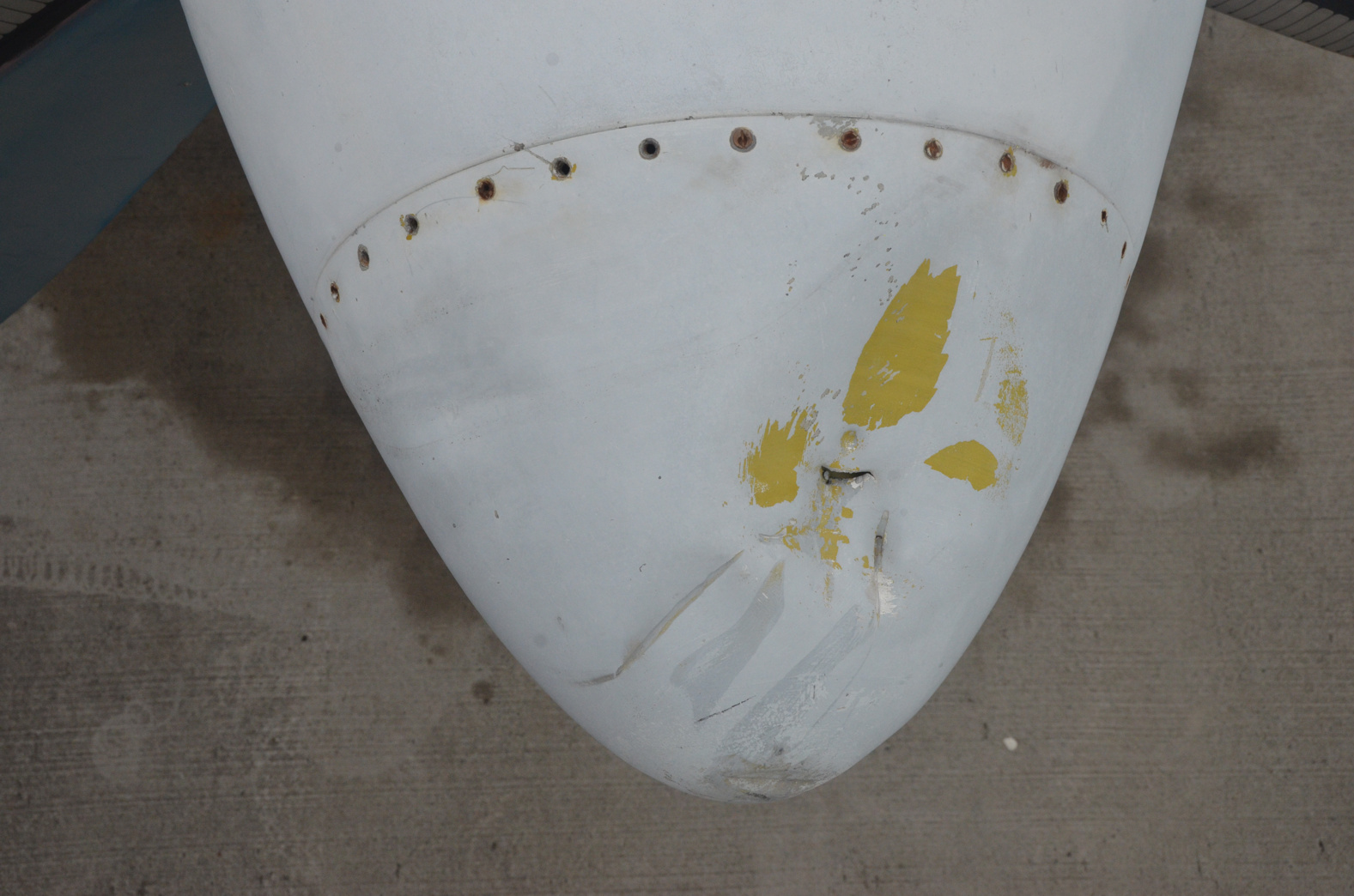 Augenscheinlich wurde der alte Lack am gesamten Rumpf abgebeizt, sogut es ging.