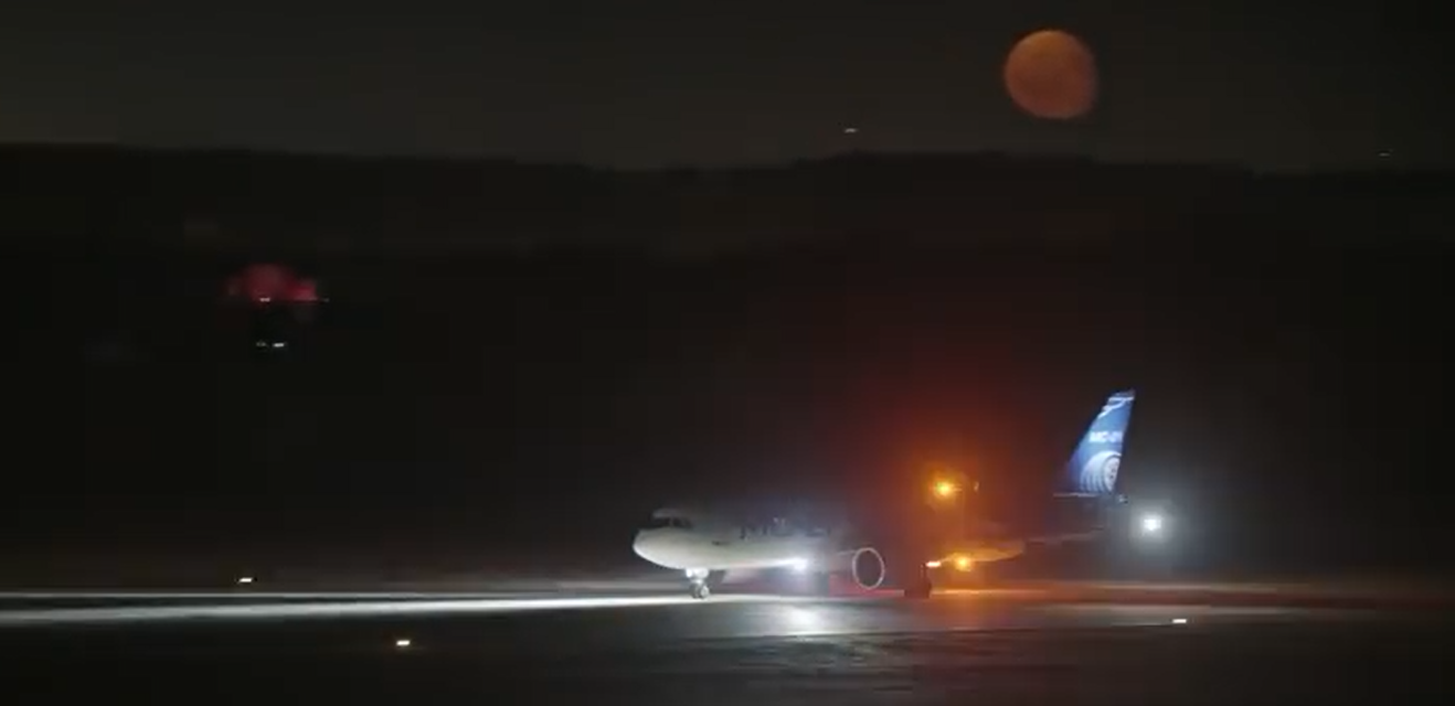 Die MC-21 bei der Erstlandung / Nacht nach zwei Bahnüberflügen aus beiden Richtungen auf dem Flugversuchsfeld und Test der Systeme.