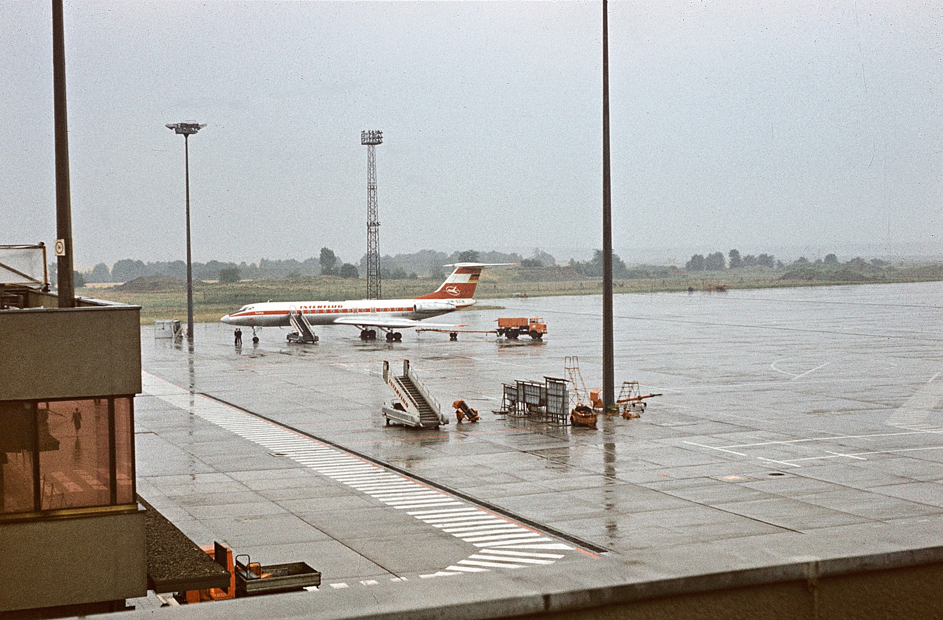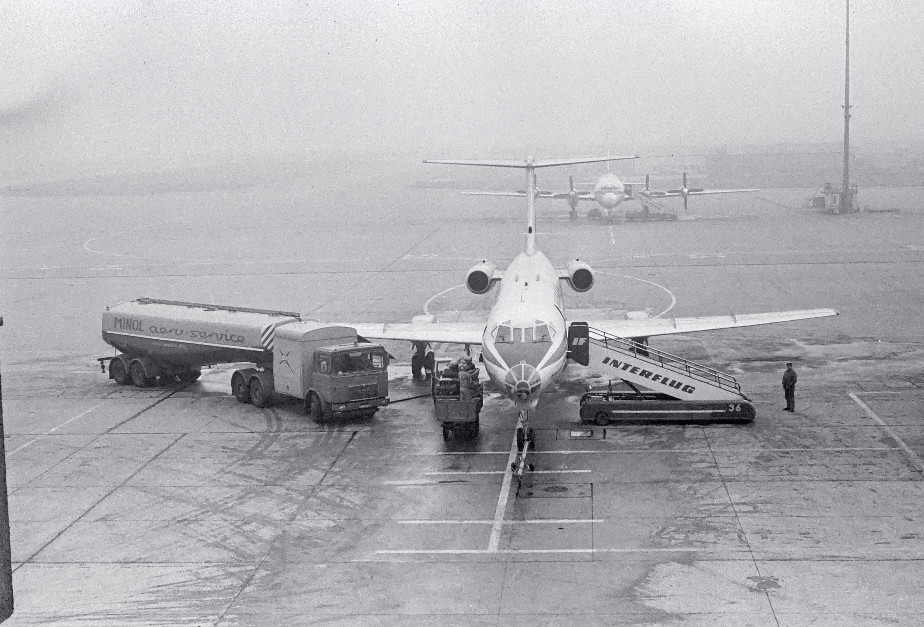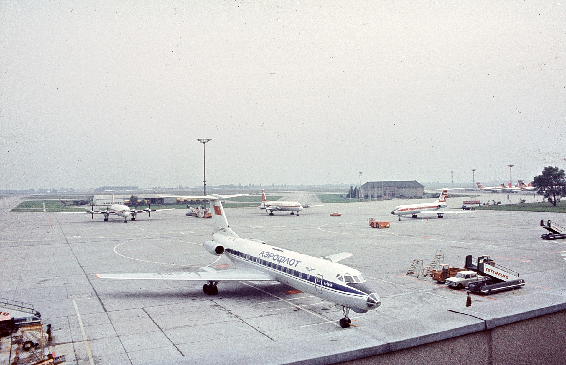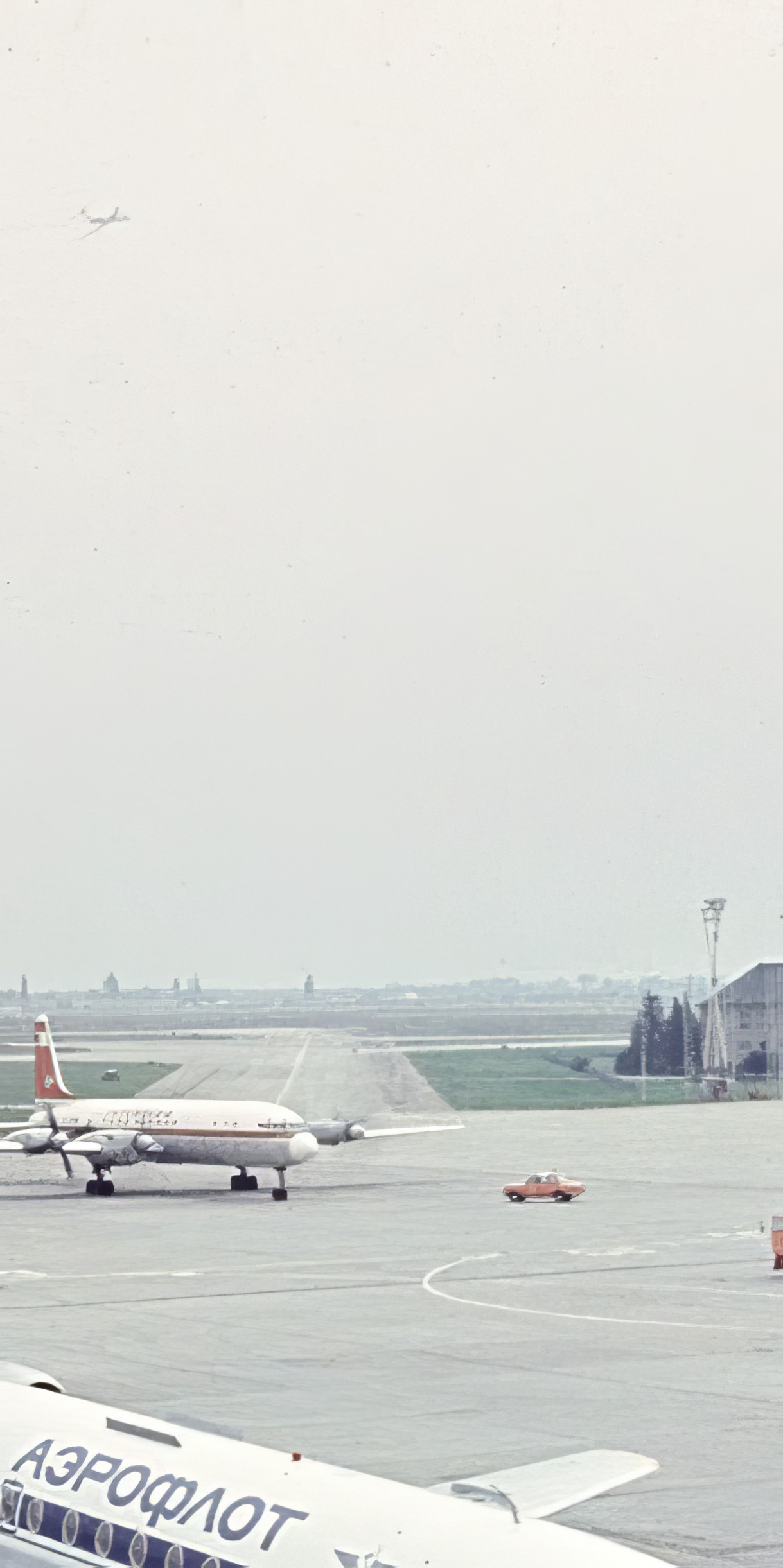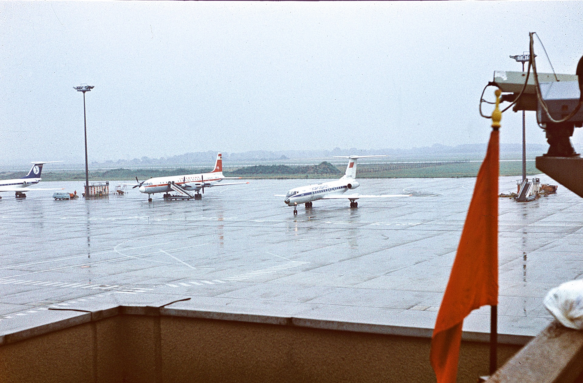 Hinter dem Leitwerk der Il-62 sieht man die sogenannte Generalsvilla, die Sonderabfertigung des Flughafens für Regierungsflüge. Das Gebäude wurde kürzlich abgerissen.