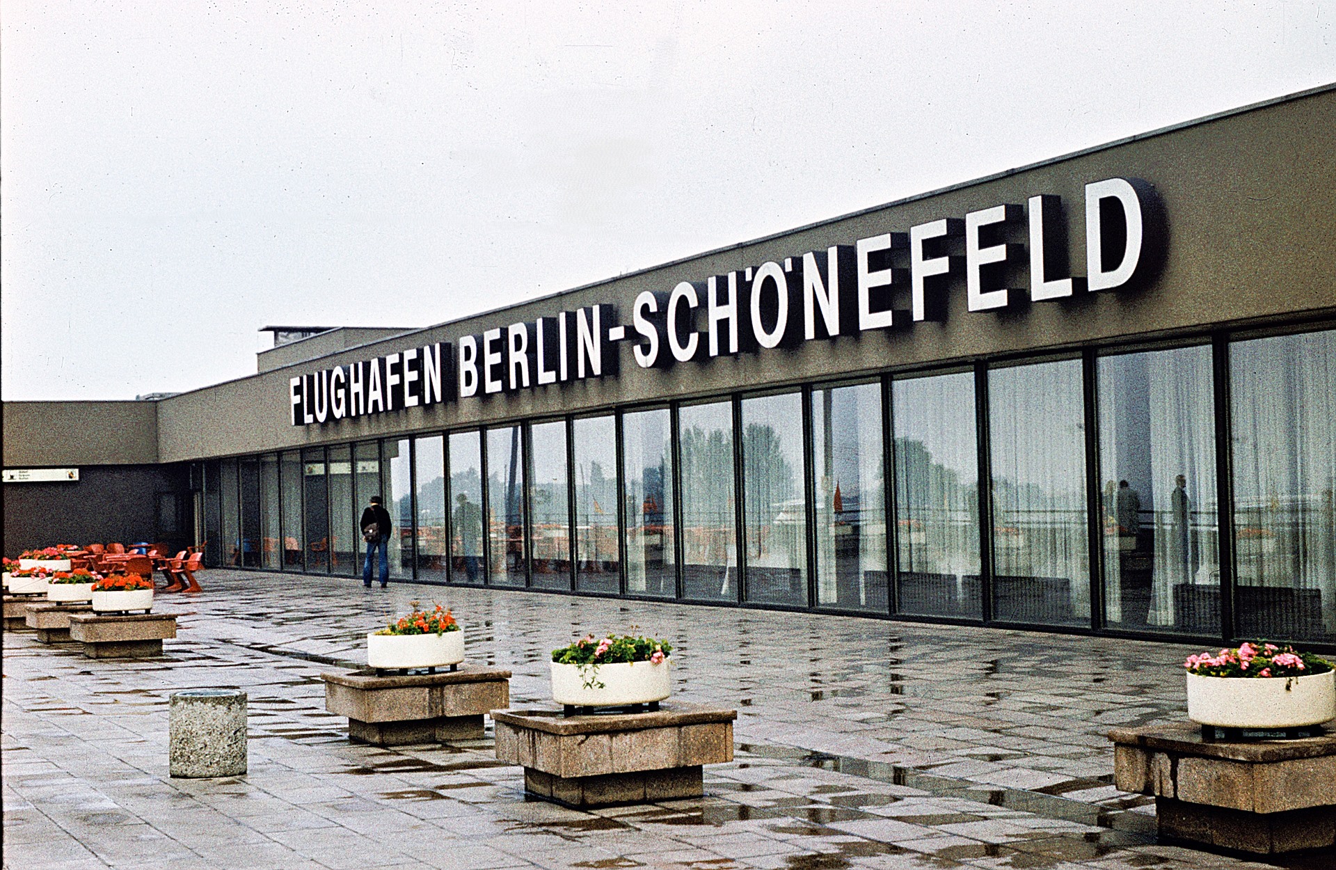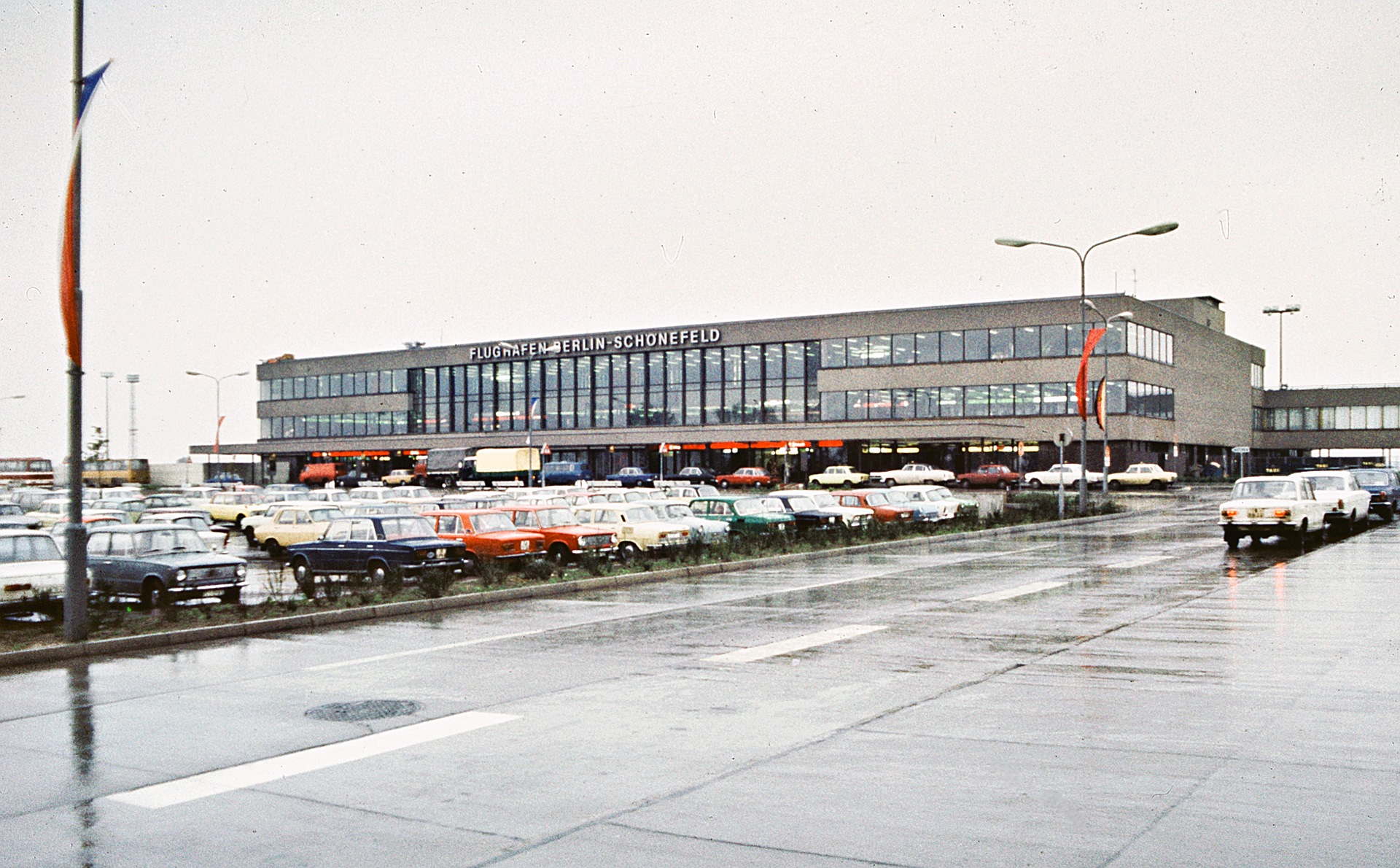 Links im Vordergrund der leere Standplatz war die Nummer 54. Er befand sich gebäudenah auf der Symmetrieachse der Neuen Passagierabfertigung (NPA), d.h., genau in der Mitte und war so etwas wie der beste Platz auf dem Flughafen Berlin-Schönefeld. So wurde er später zum repräsentativen Stammplatz für die Iljuschin Il-86 der Aeroflot.