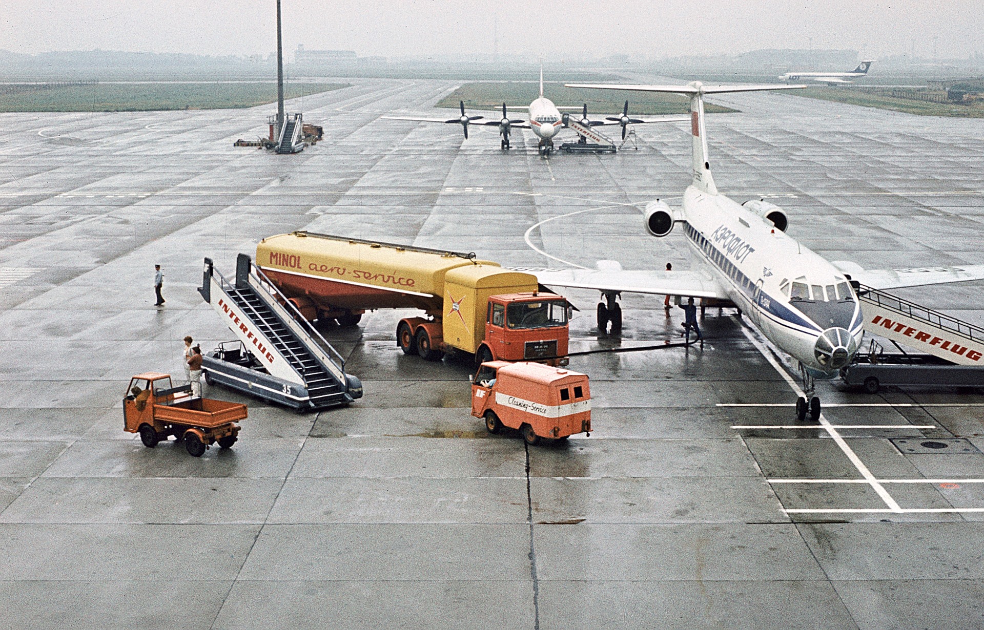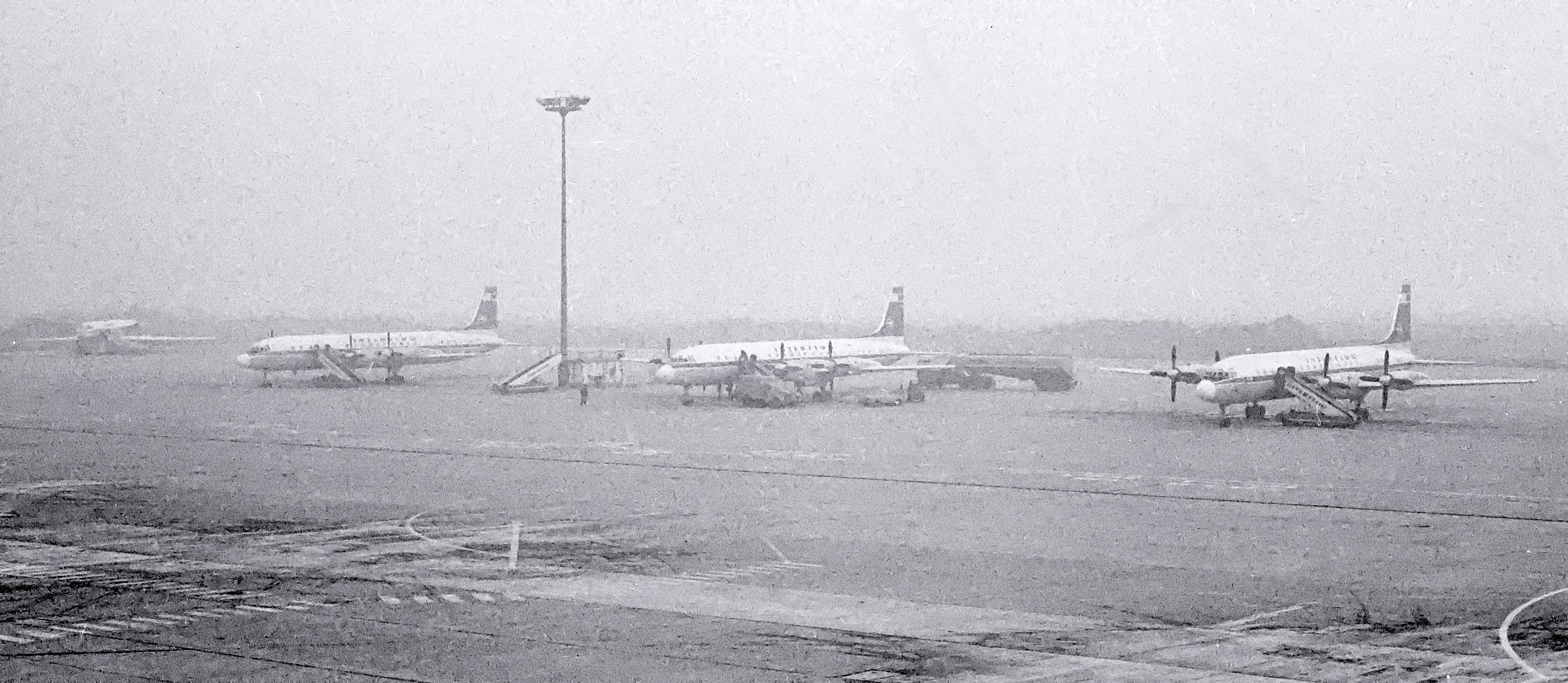 Hinter den beiden Il-18 erkennt man die Rollbahn H (Taxiway HOTEL), die bei Nutzung der Start- und Landerichtung 25 (westliche Winde) zum Abrollen von der Ramp 3 diente. Die Tango Delta wird nach dem Passieren ihrer Schwester gleich auf die HOTEL einbiegen.