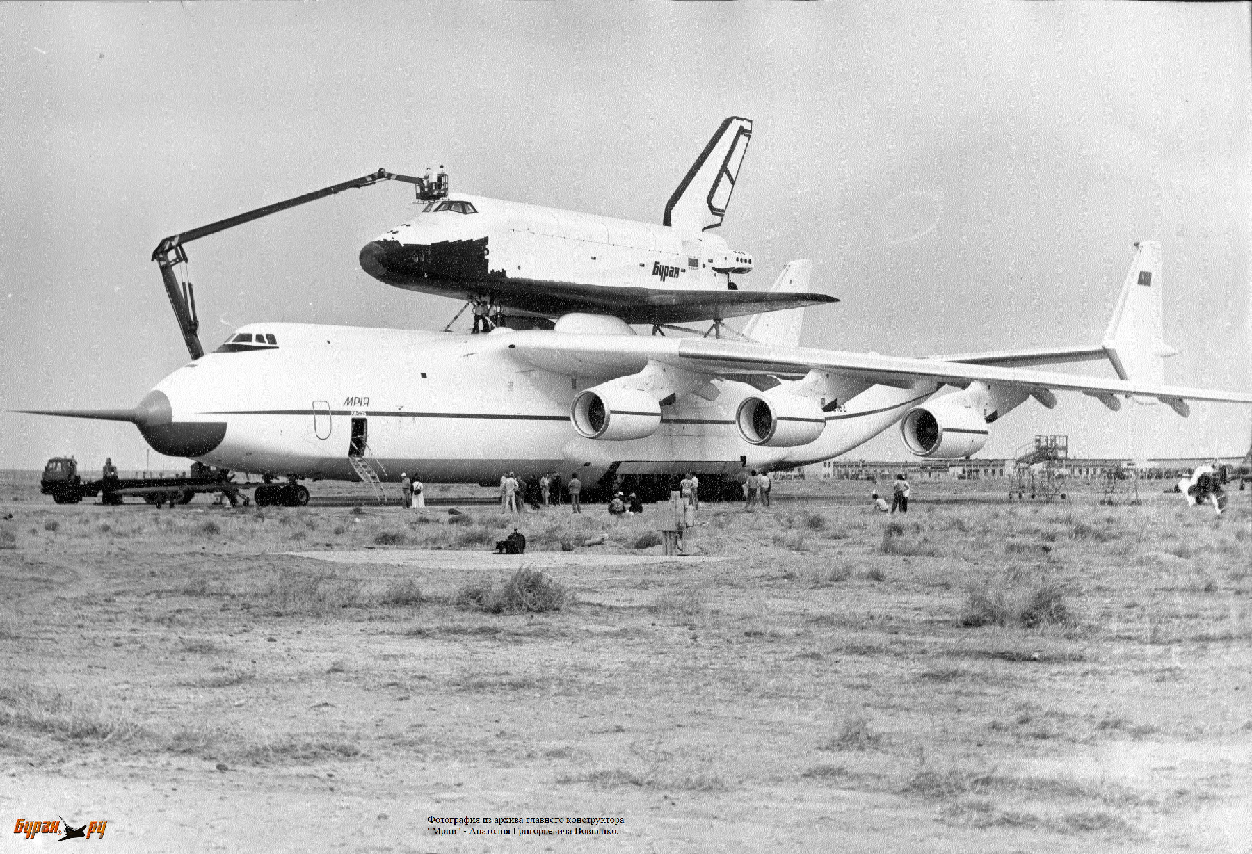 Hier erfolgt die Inspektion der Buran nach ihrer ersten Integration auf dem Träger AN-225 Mrija, Mai 1989.- Archiv des Mrija-Chefdesigners