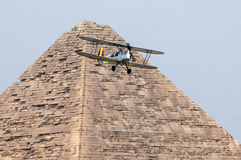 Hier der Doppeldecker des ägyptischen Piloten Yasser Menaissy bei einer der großen Pyramiden von Gizeh. ©AFP 2016/ Khaled Desouki aus obigen Link