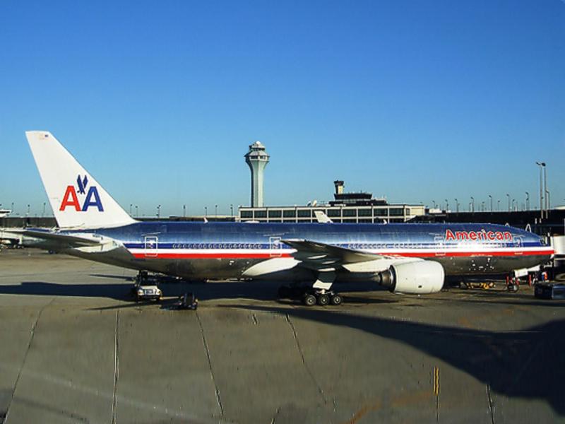 Boeing 777-223ER (N796AN) der American Airlines am 7. August 2008 bei stahlblauem Himmerl auf dem Flughafen Chicago-O'Hare. Auch diesem großen Flugzeug kann man aus der 747 gerade noch so auf's "Dach" schauen.