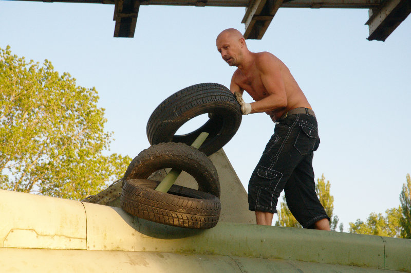 Der (ungleich leichtere) Rumpf der MiG-21 schwebt am Haken
