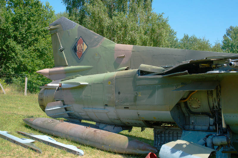 Die MiG-23 scheint noch ein Geheimnis zu bergen. Bei genauerer Betrachtung scheint man Ihr ein komplett neues Heck verpaßt zu haben. Die Farbgebung ist sehr unterschiedlich, das Heck ist nicht nur komplett russisch beschriftet (im Gegensatz zum Rumpf, der eine gemischte Beschriftung trägt), es hat auch andere Farben (die original russischen, wie es scheint) und die Grenzen von hellblauer Lackierung unten und braun/grüner oben sind zwischen Heck und Rest sehr unterschiedlich.