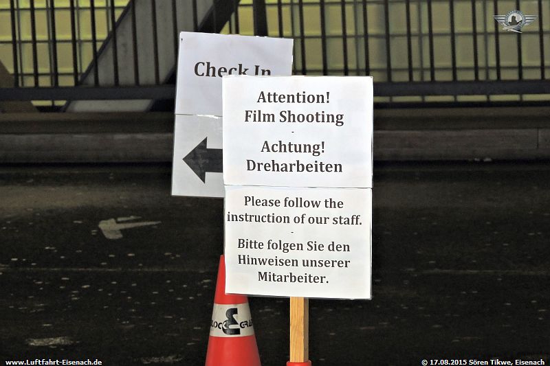 Meine Anreise von Eisenach nach Leipzig verlief wie immer. Ich stieg aus der S-Bahn am Bahnhof Leipzig/Halle Flughafen aus und fuhr die Rolltreppen Richtung Terminal hoch. Am Ende der Rolltreppe begegnete mir schon das erste Hinweisschild auf die Dreharbeiten mit diesem Wortlaut:
