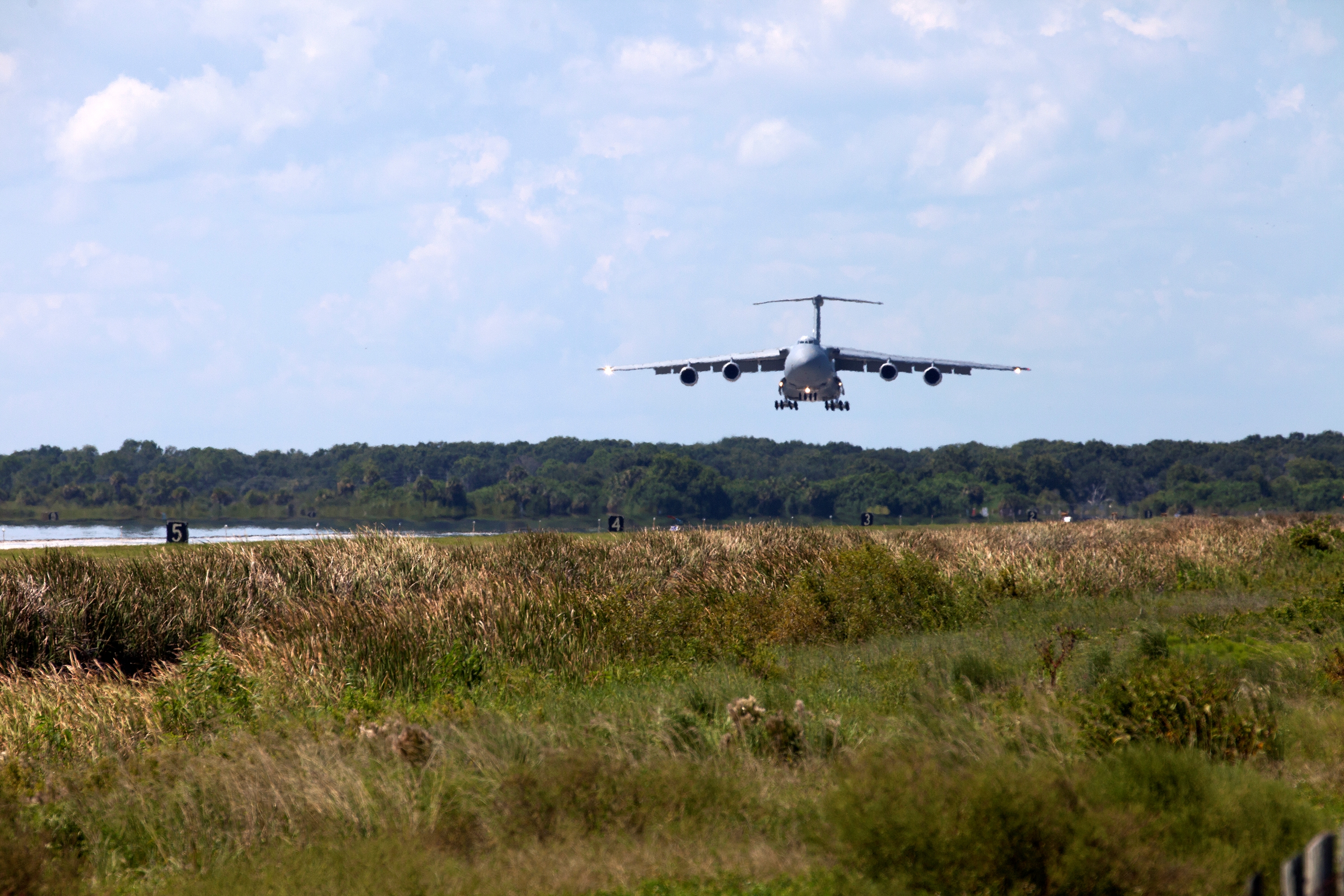 -Eine Galaxy C-5 Transportmaschine der USAF im Anflug auf die Shuttle Landebahn (SLF) im KSC ~ Ende August