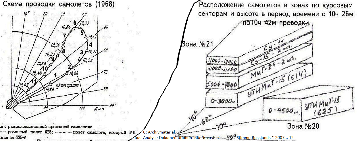 Nach (vorzeitigem) Programmende und Genehmigung zur Rückkehr zum Einsatzflugplatz muß Gagarin im Sinkflug den Wert von 70° auf 320° (?)Ausflugskurs ändern (nach dem Schema der Radarbegleitung - durchgehende Linie ist 625 realisiert / gestrichelt 625 vorgesehen),
