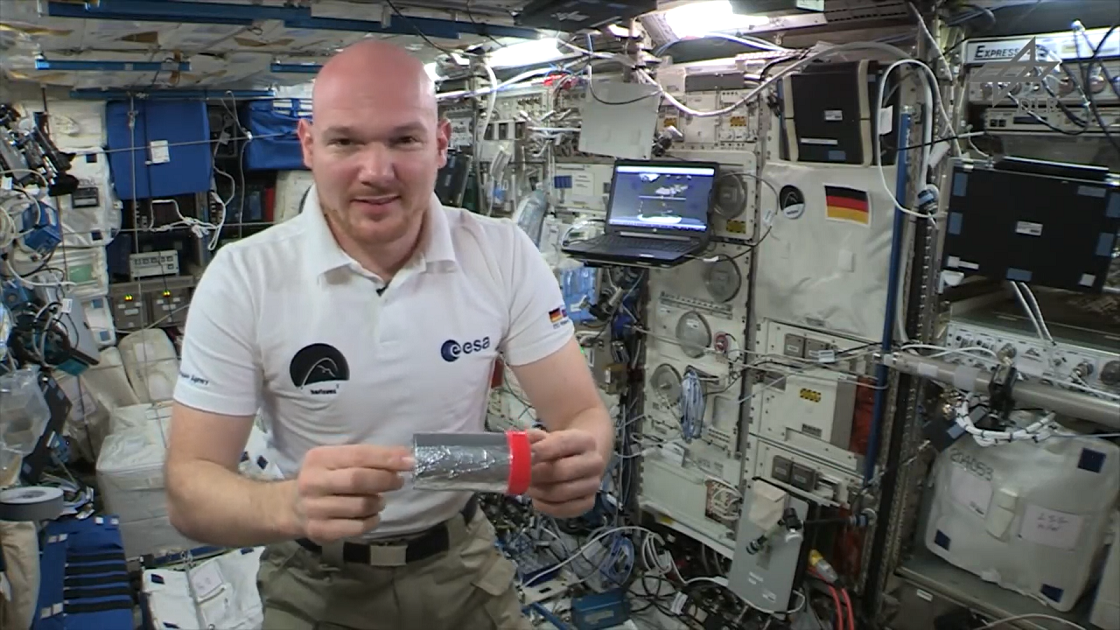 Alexander Gerst experimentiert - mittels Reibung werden Kristallstrukturen erzeugt und illustriert damit die Untersuchung von Plasmakristallen im Orbit