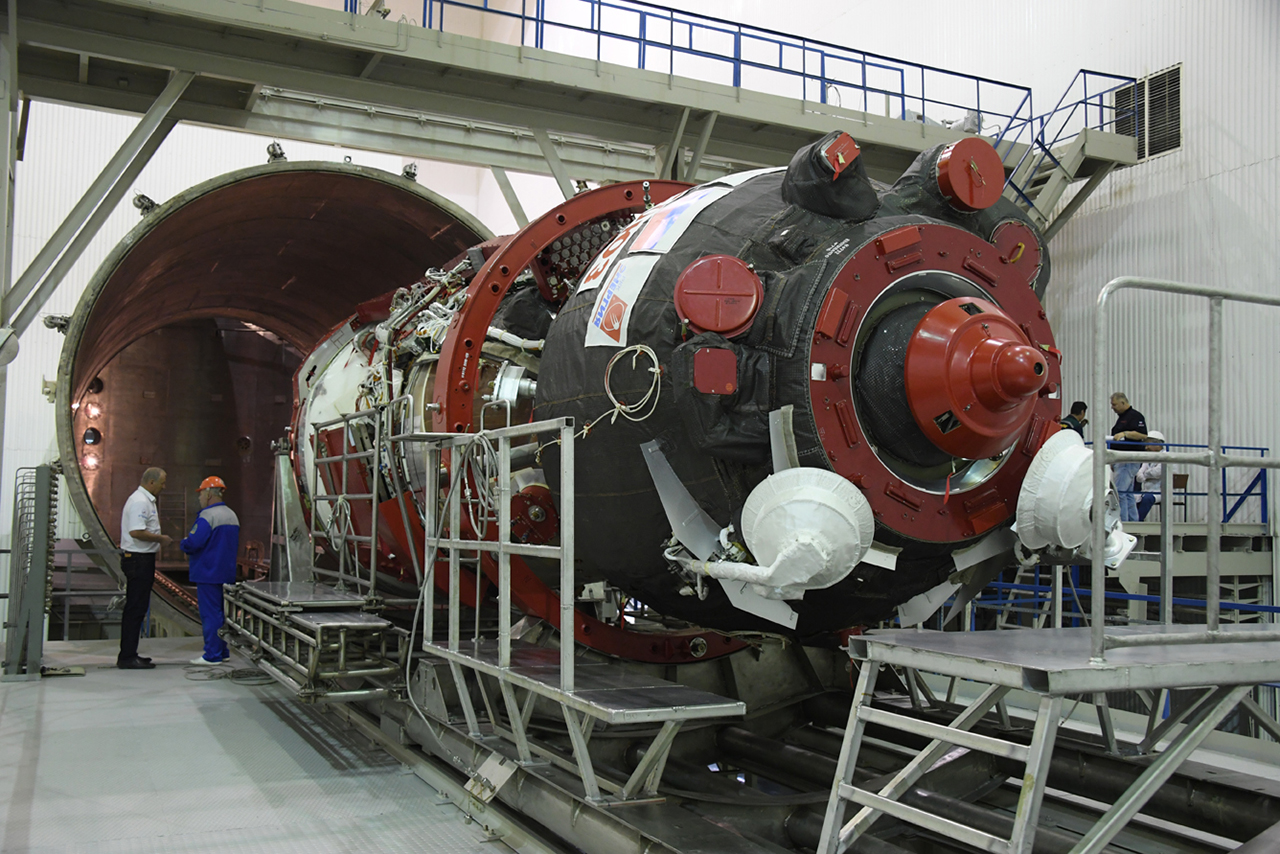 Zum Vorbereitungszyklus des Raumschiffes Sojus MS-13 für den Start am 20. Juli gehört die Dichtigkeitsprüfung direkt auf dem Kosmodrom