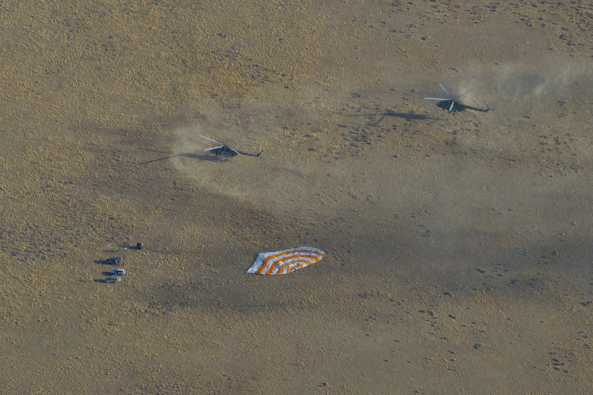 Im Rückblick gibt es heute zwei erstklassige Fotostrecken von der Landung wie der Zeremonie am kasachischen Flughafen Dsheskasgan vor Abflug nach Koroljow