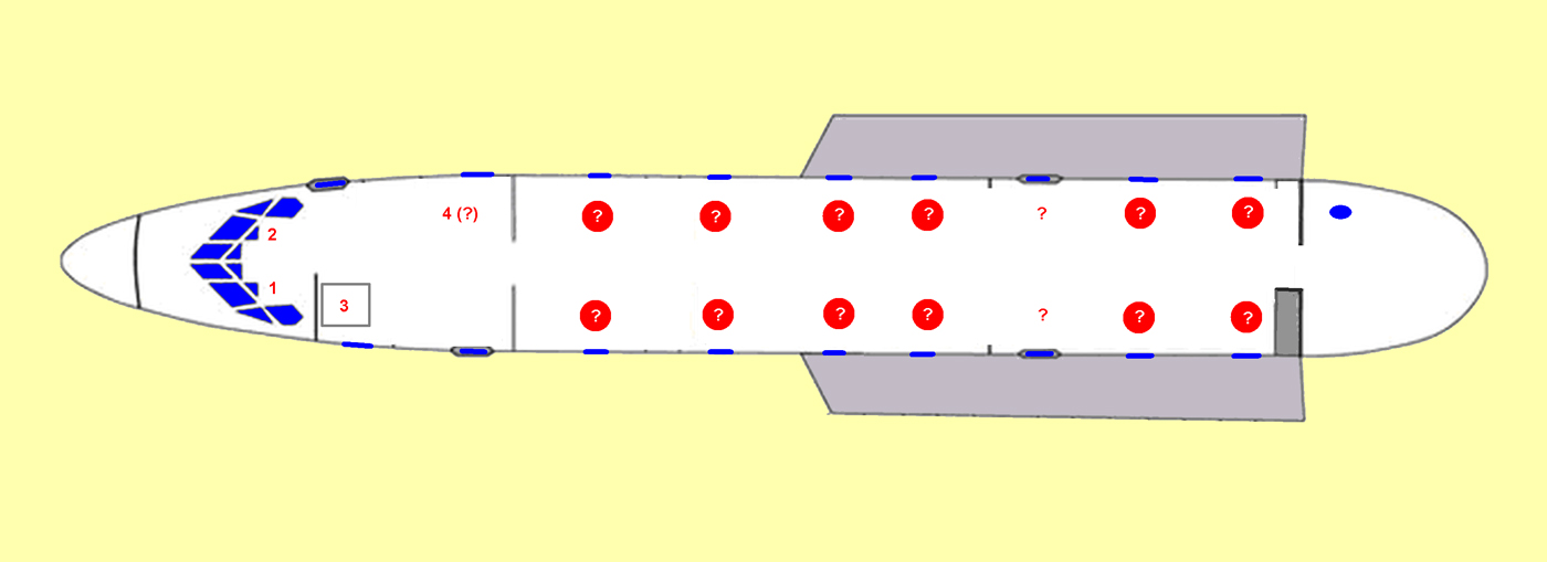 Die roten Punkte mit den Fragezeichen, also da vermute ich 1 Fenster gleich 1 Arbeitsplatz, an den beiden Notausstiegen auf der Tragfläche hat vielleicht niemand gesessen aus Havariegründen.