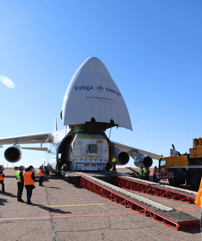 Die Spezialisten des Spacecenters RZ Jushny (TsENKI/Roskosmos) entluden und transportierten die Container zum Kosmodrom, wo das gemeinsame technische Team mit der Vorbereitung der Satelliten für den bevorstehenden Start auf dem Sojus-2.1 b-Träger mit der Fregat-Oberstufe begann.