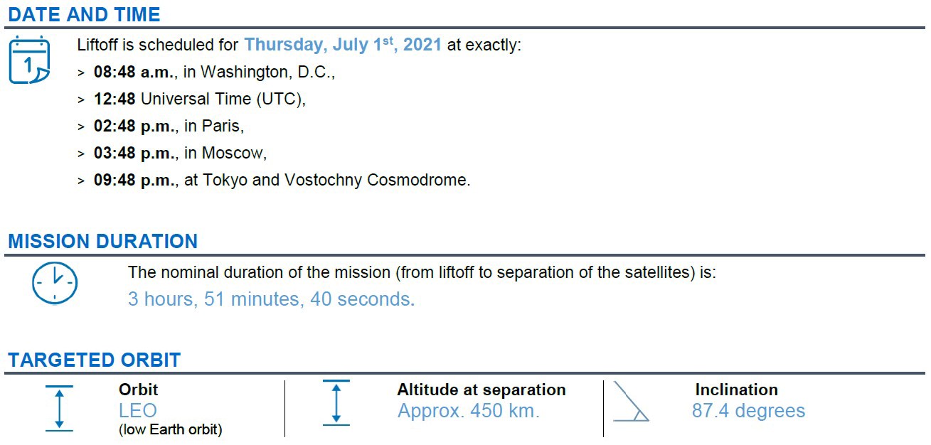 Die Mission Flug ST33 vom 01. Juli, die fünfte kommerzielle Mission vom Kosmodrom Wostochny, die von Arianespace und seiner Starsem-Tochter durchgeführt wurde, hat mit 36 neuen OneWeb-Satelliten die Flotte auf 254 Satelliten ergänzend, in eine fast polare Umlaufbahn in einer Höhe von 450 Kilometern gebracht. Nach der Trennung werden sich die Satelliten in ihre operative Umlaufbahn heben.