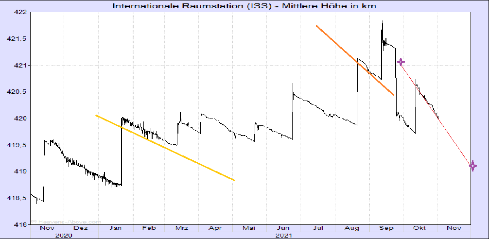 Abgesehen davon gibt es aber wieder einen "Push nach oben" - die ISS-Umlaufbahn wird am 16. November auf fast 421 km angepaßt.