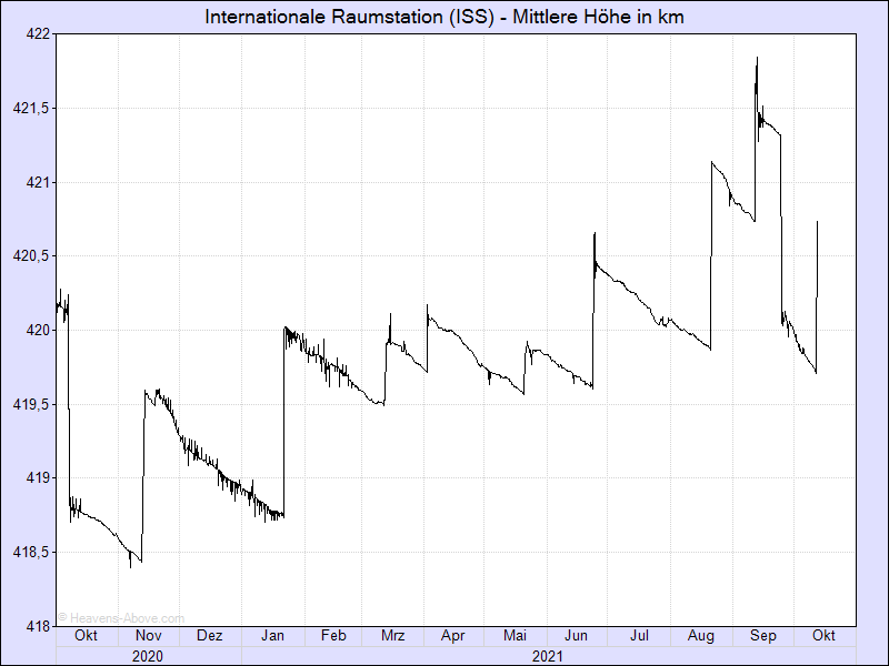 - die Triebwerke des Servicemoduls "Swesda" arbeiteten 38,9 Sek. für die Bahnanhebung um 940 m auf eine mittlere Bahnhöhe von 420,45 Km
