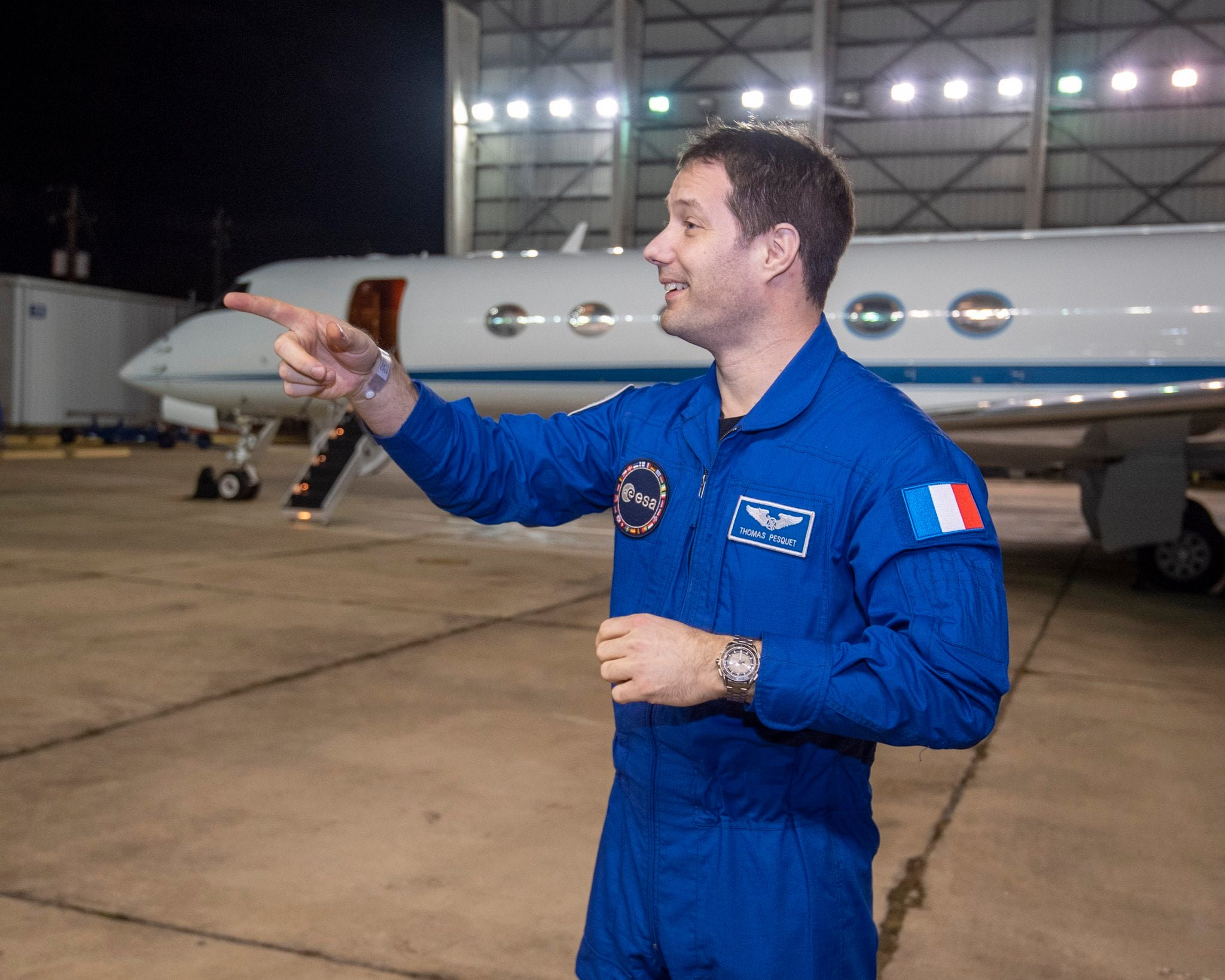 - ESA Astronaut Thomas Pesquet mit guter Laune, nachdem er heute Morgen am Ellington Airport / Houston angekommen war, vor seinem Transatlantikflug nach Köln