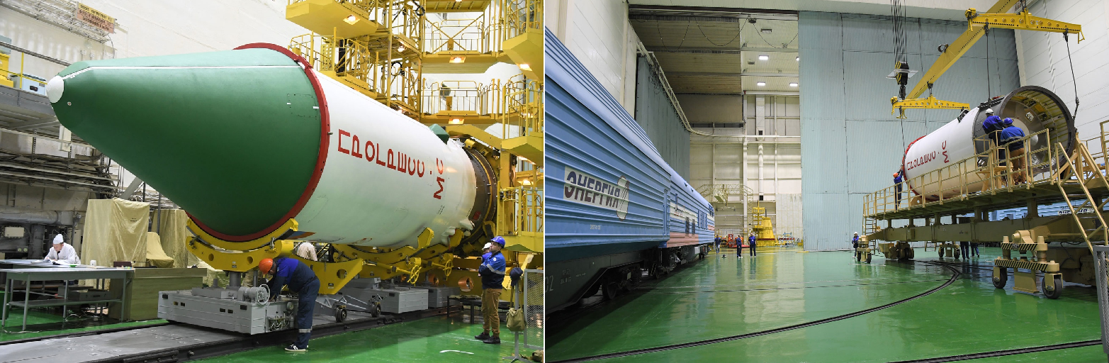 Überführung - Es erfolgte der Bahntransport im gedeckten Klimawaggon von Energija zum MIK-40, Pl. 31, wo die Integration mit der Trägerrakete Sojus-2-1a erfolgen wird, das sind um die 40 Km Fahrtstrecke. Bildquelle: vk/roscosmos / Energija NovKos (Mod. Zandr) [edit]