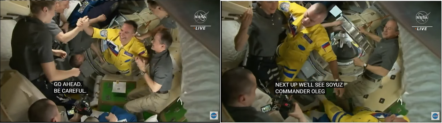 (Die "Botschaft" dürfte sich mit etwa Überlegung allerdings anders erklären lassen, denn: Das Design der Fluganzüge der Kosmonauten des Raumschiffs "S.P. Koroljow" (Sojus MS-21) wurde lange vor den Ereignissen in der Ukraine vereinbart ... ( Leiter des Pressedienstes von Roskosmos Dmitry Strugovets)