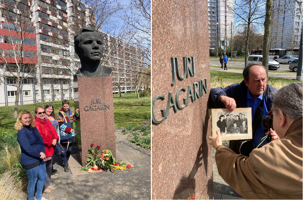 "Heute am 12. April 2022 haben Vertreter der deutschen Nichtregierungsorganisationen und russischen Landsleuten sowie einfache BürgerInnen Blumen am Gagarin-Ehrenmal in Erfurt niedergelegt. Die Aktion fand im Rahmen des Jahrestags der ersten bemannten Raumfahrt statt."