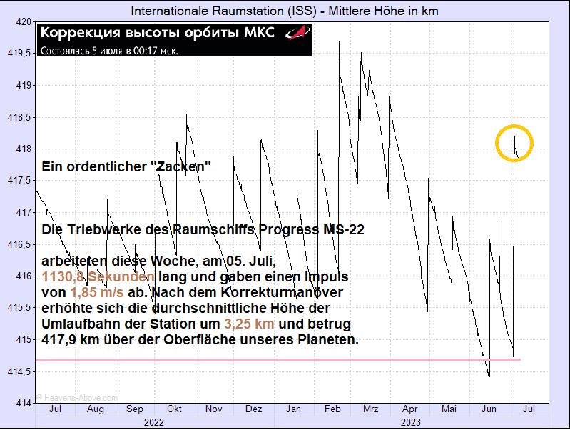 Infolgedessen erhöhte sich die durchschnittliche Höhe der Umlaufbahn der Station um 500 m auf 416,4 km (Heavens Above scheint heute auch Sonntag zu haben >grins< , die Verlaufskurve ist noch nicht aktualisiert )