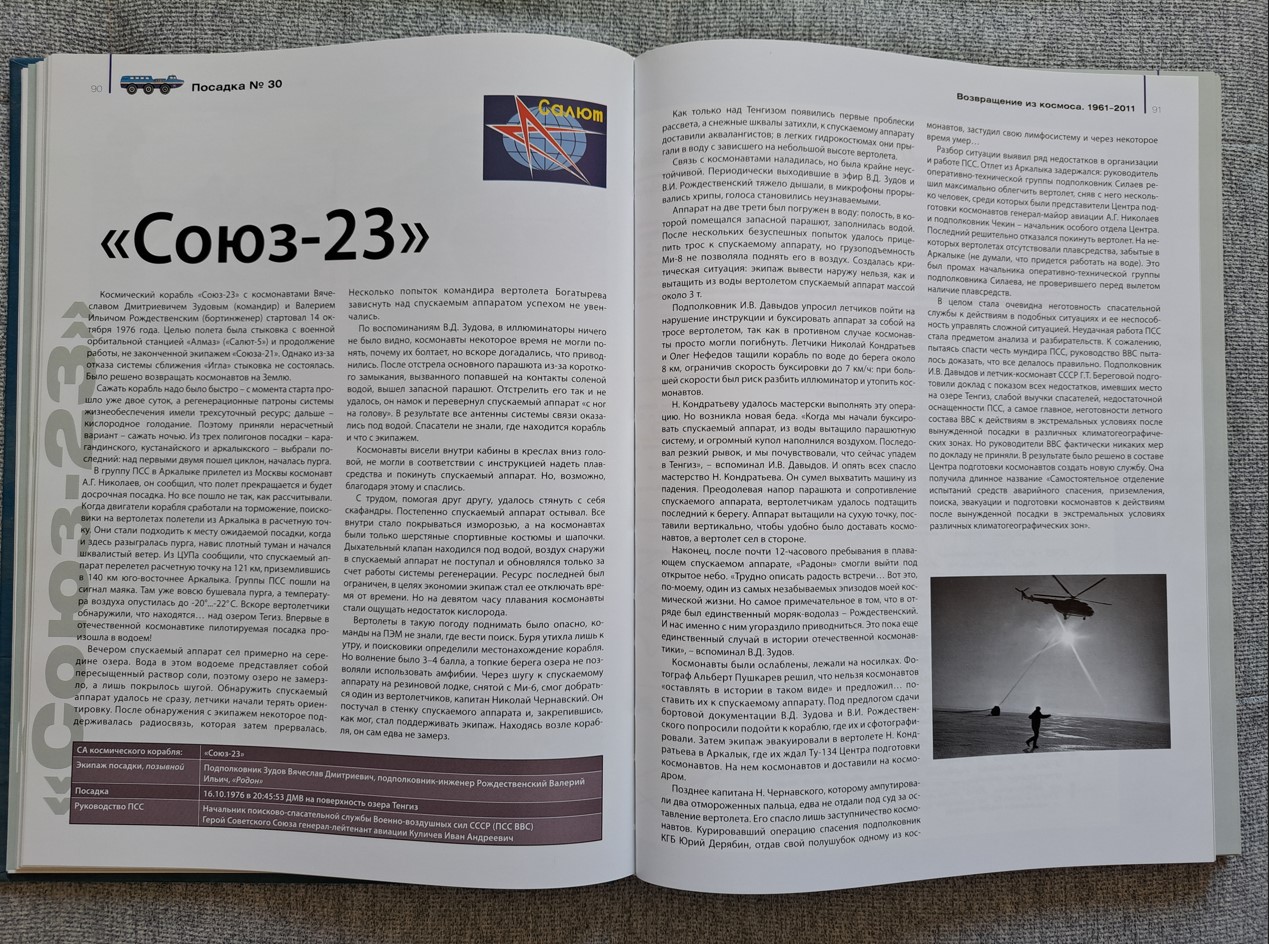 In einem Punkt muss ich dich allerdings korrigieren: Es war nicht der Hauptfallschirm von Sojus-23, der sich nicht ausklinken ließ, sondern der Reservefallschirm, der infolge eines Kurzschlusses durch eingedrungenes Salzwasser eine viertel Stunde nach der Wasserung ausgeworfen wurde und sich durch den starken Wind entfaltete. Dadurch wurde die Kapsel noch weiter vom Ufer des Tengis-Sees weggezogen und die Luke der Kapsel geriet unter Wasser. Nicht ganz klar ist mir, ob man den Reservefallschirm konstruktiv bedingt nicht abwerfen konnte (weil so etwas nicht vorgesehen war), oder ob es beim Versuch des Ausklinkens zu einer weiteren Fehlfunktion gekommen ist.