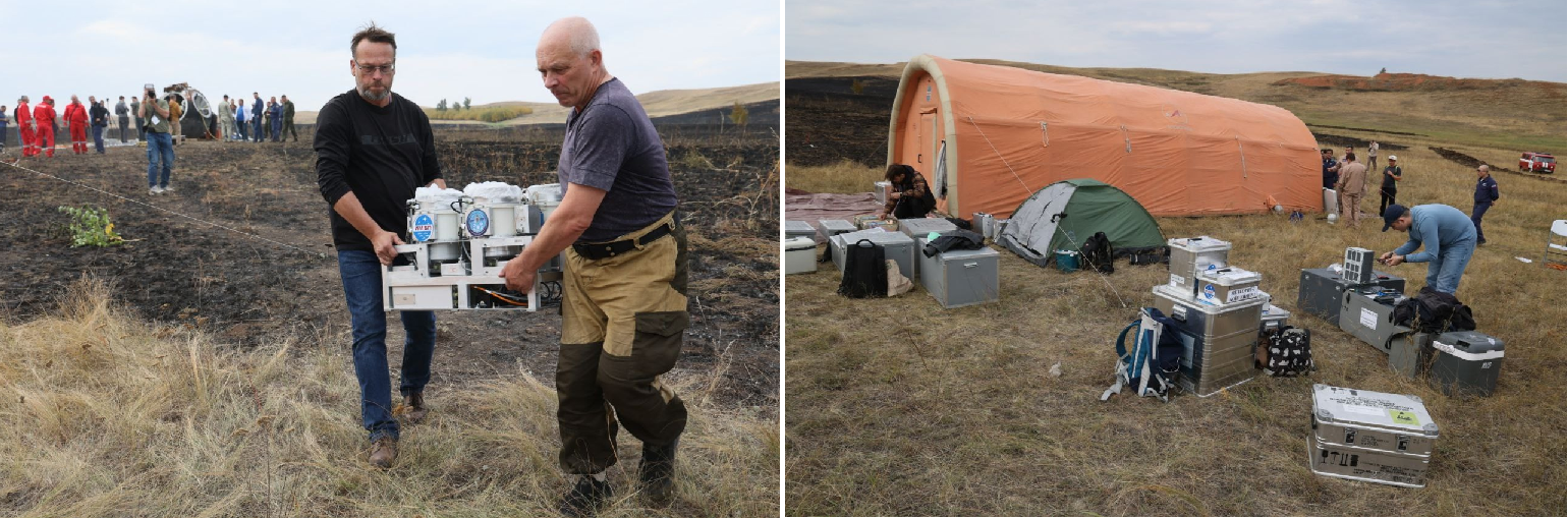 Noch am Landeplatz der Kapsel führen Wissenschaftler und Spezialisten des Instituts für Biomedizinische Probleme (IBMP) in einem medizinischen Zelt die ersten Nachflugstudien durch.