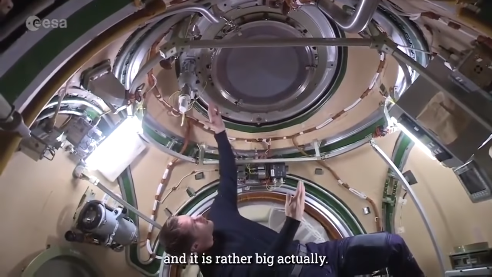 ... Wir haben auch ein neues Fenster, das im Moment geschlossen ist, aber das geöffnet werden kann. Es sieht ein bisschen aus wie ein kaputtes Kameraobjektiv, das ziemlich groß ist. In der Tat ist es ziemlich groß und es schaut ein wenig unter 45 Grad zur Erde. Also, das wäre ein wirklich großartiger, toller Ort um die Erde zu beobachten, wenn es erst einmal geöffnet wird".