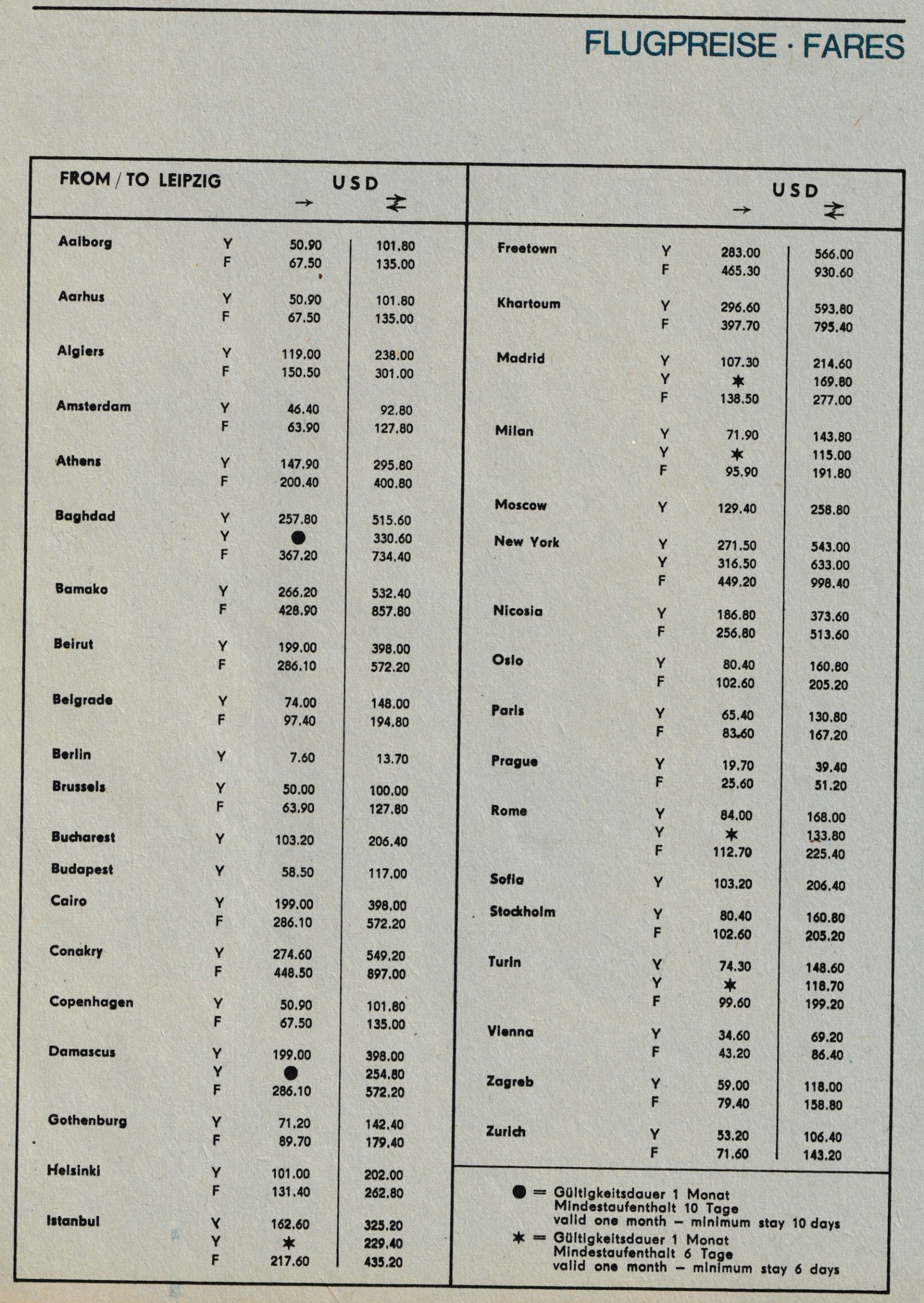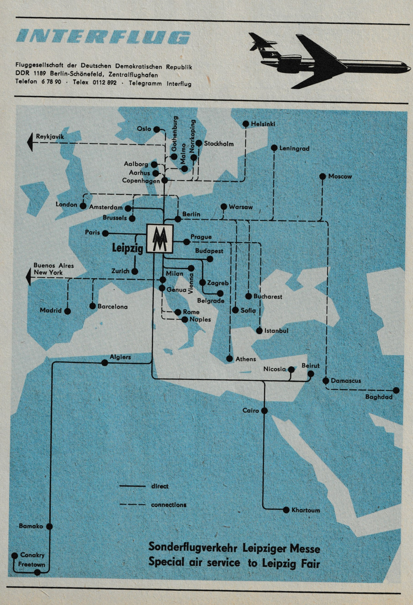 Die Langstreckenflüge waren keine Direktflüge von/nach Leipzig. Bei den INTERFLUG-Flügen wurde entweder in Berlin umgestiegen oder an einem Zielort eines IF-Messefluges (z.B. Milano oder Kopenhagen). Die anderen Leipzig anfliegenden Fluggesellschaften sind ebenfalls mit Umsteigeverbindungen im Plan aufgeführt (z.B. mit IF nach Kopenhagen, dann weiter mit SAS nach New York).